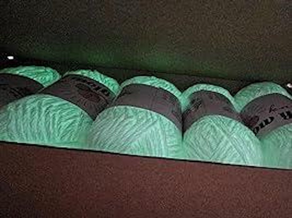 I recently got some of the glow in the dark yarn, these things are VERY glowy!!! It even glows in the daytime thats how powerful they are! I left them out in the sun and left to go to work. I texted my brother to brung them back inside and he said they looked "radioactive" lol!!